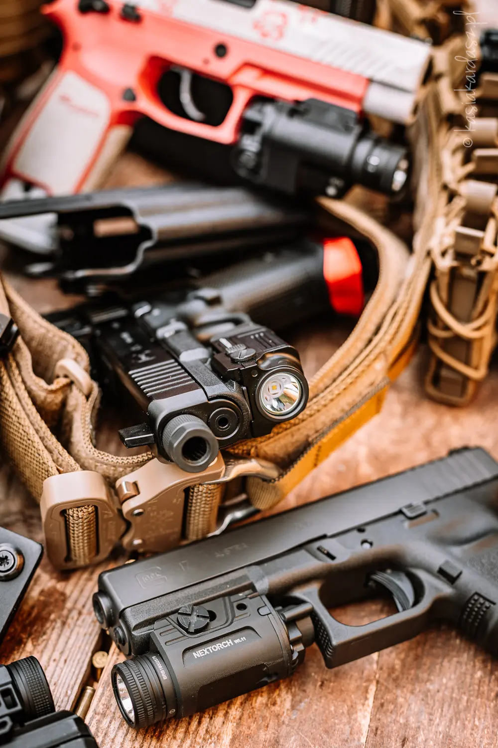 • latarki pistoletowe marek Nextorche i Nitecore – uchwycone w warunkach o zmiennym świetle,